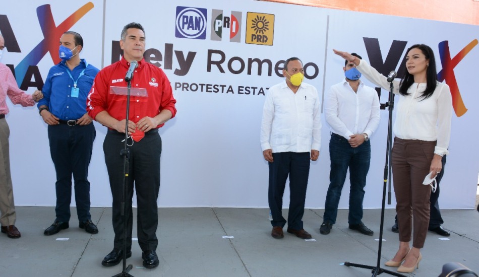 Al término de este mensaje, el dirigente nacional del PRI, Alejandro Moreno tomó protesta a Mely Romero, con el respaldo de las dirigencias nacionales del PAN y PRD, y sus homólogos en las dirigencias estatales.