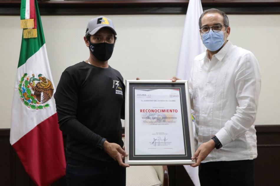 El gobernador José Ignacio Peralta Sánchez hizo entrega del reconocimiento Orgullo Colimense a Martín García Arredondo por su trayectoria y aportación al Motocross colimense, en un evento realizado en la Sala de Juntas de Casa de Gobierno.