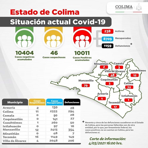 La Secretaría de Salud y Bienestar Social informa que las defunciones ocurrieron en 2 hombres mayores de 65 años de edad, que estaban hospitalizados graves; uno era originario de Coquimatlán y otro foráneo que se atendía en Villa de Álvarez.