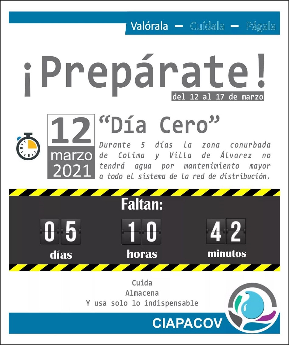 La Comisión Intermunicipal de Agua Potable y Alcantarillado Colima Villa de Álvarez (CIAPACOV) da a conocer que por la urgente necesidad de realizar mantenimiento de todo el sistema de extracción y distribución de agua, la zona conurbada de Colima y Villa de Álvarez estará sin agua 5 días a partir del día 12 de marzo.