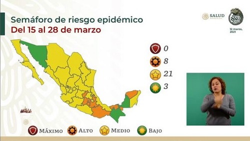 El estado de Colima, al igual que 20 entidades federativas más, continuarán en color amarillo, que es riesgo moderado, lo que resta del mes de marzo, en el semáforo epidemiológico que el gobierno federal establece en la contingencia sanitaria que se vive por la pandemia del Covid-19.