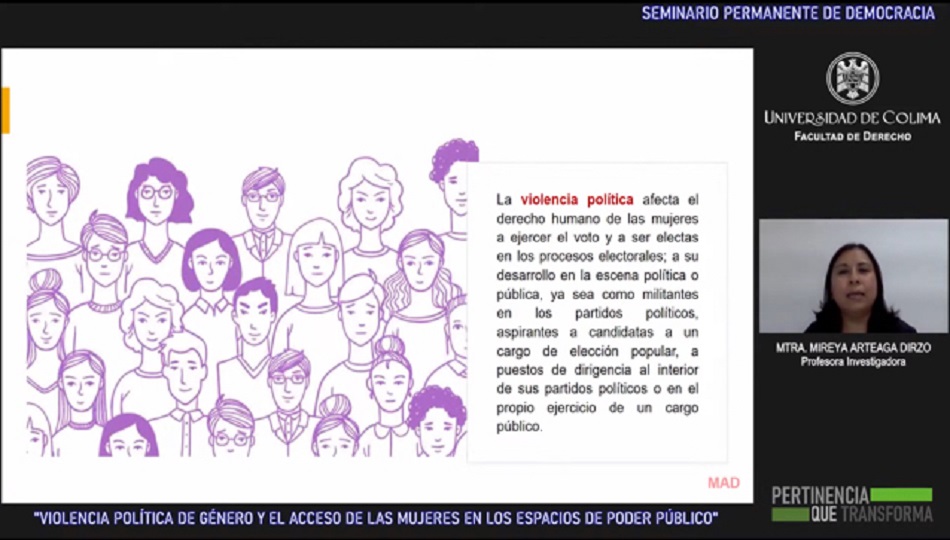 Arteaga Dirzo participó en el Seminario Permanente de Democracia que realiza la Facultad de Derecho de la Universidad de Colima con la conferencia virtual: “Violencia política de género y el acceso de las mujeres en los espacios de poder público”, donde realizó un puntual recorrido por los conceptos y aspectos de la violencia política y expuso los retos para que las mujeres ejerzan sus derechos políticos.