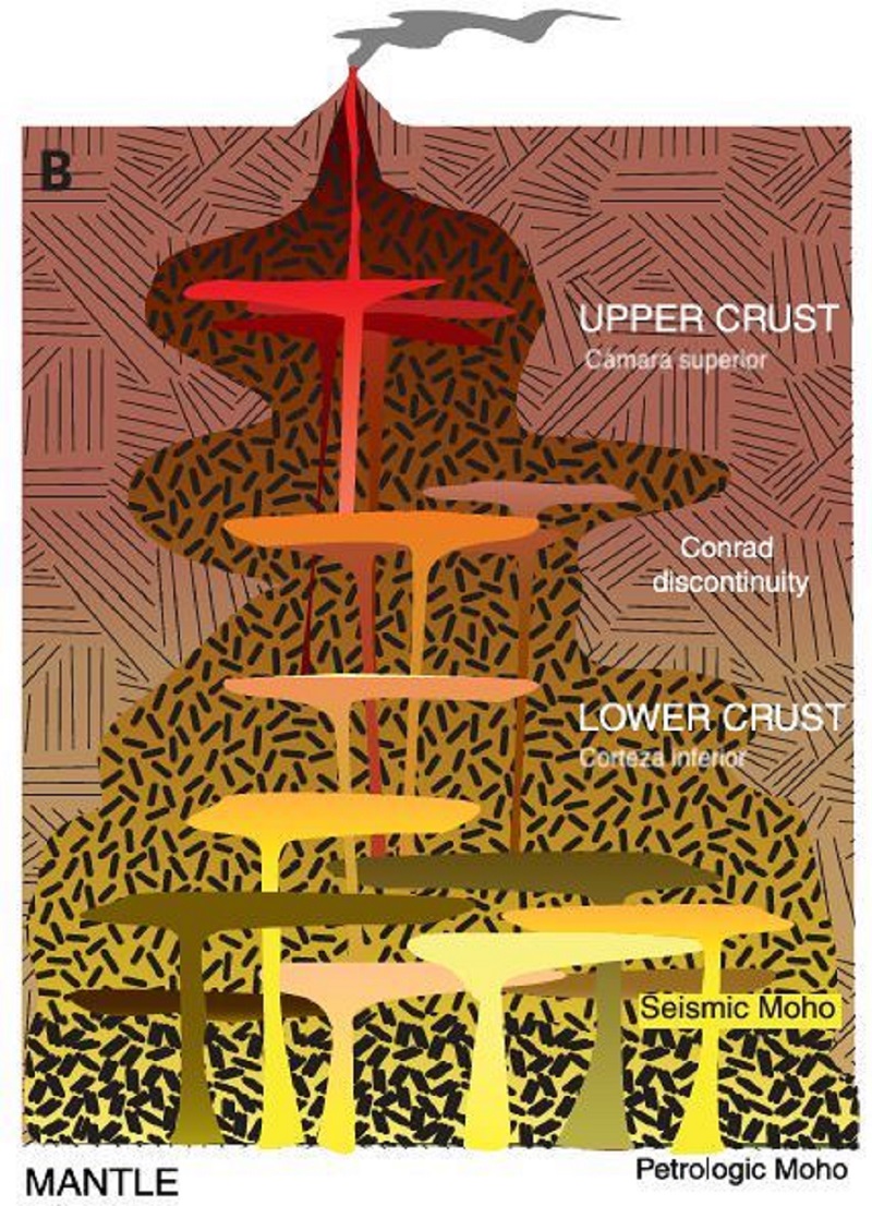 “Imaginemos -dijo- 20 o más cavidades llenas de magma estancado en un sistema que se extiende desde la superficie del volcán hasta el manto de magma, a una profundidad de 40 o 50 kilómetros, tal vez más”. Estos reservorios magmáticos, aseguró, “pueden durar cientos o miles de años allí o el magma puede movilizarse por un aumento de temperatura y ascender presentando una erupción”.