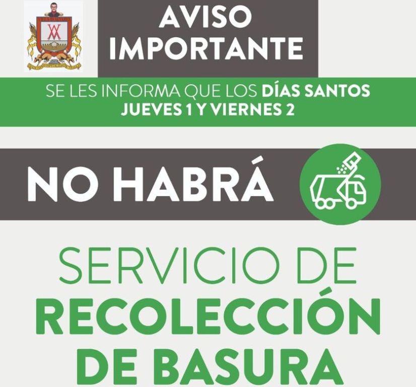 Villa de Álvarez, Col. No habrá servicio de recolección de basura los días santos, jueves 1 y viernes 2 de abril.