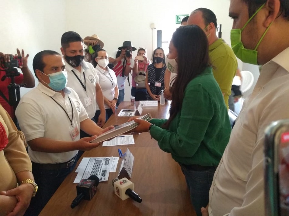 Estando presente también la líder estatal del PVEM, Gabriela Benavides Cobos, Karina Heredia entregó la documentación requerida por la legislación electoral para que sea considerada para encabezar la planilla para el Ayuntamiento villalvarense ante los integrantes del Consejo Municipal Electoral.