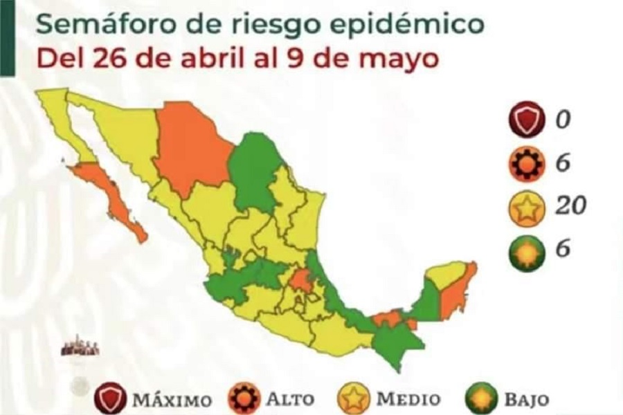 A través de la conferencia de prensa diaria que esta dependencia federal realiza desde Palacio Nacional, el subsecretario de Salud, Hugo López-Gatell Ramírez informó que, del 26 de abril al 9 de mayo, seis estados de la República estarán en color anaranjado (riesgo alto), 20 en amarillo (riesgo moderado) y seis en color verde (riesgo bajo).