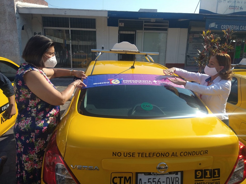 Villa de Álvarez, Col. La candidata a la presidencia municipal de Vila de Álvarez por la Coalición Va X Colima, Tey Gutiérrez, realizó junto a su equipo de trabajo una pega de calcas a taxistas adheridos a la CTM y a la CNOP.