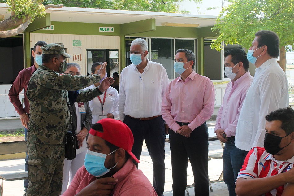 Durante el recorrido, el rector visitó las áreas de espera, vacunación, recuperación, auxilio médico y captura de datos. Estuvo acompañado por el delegado regional Carlos Alberto Montes Carvajal y por autoridades del sector educativo, del ISSSTE y la Marina.