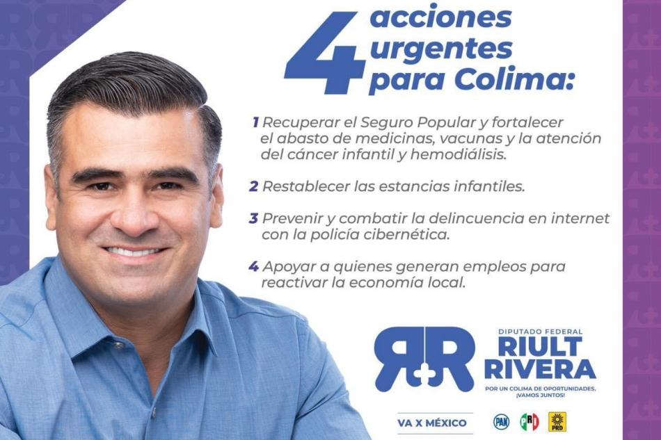 Riult Rivera Gutiérrez, Candidato a Diputado Federal por la Coalición “Va por Colima”, durante su recorrido por el Distrito I Federal, fue recolectando las demandas y necesidades que la población solicitaba resolverse, considerándose prioridad para una mejor calidad de vida de los pobladores, por lo que presentó 4 acciones urgentes.