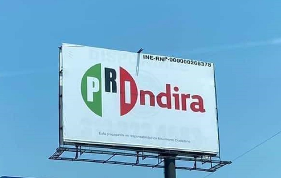 De acuerdo a la medida dictada por la Comisión de Denuncias y Quejas del IEEC, en este caso concreto denunciado por el Partido Revolucionario Institucional a través del Procedimiento Especial Sancionador CDQ-CG-/PES-32/2021, “la propaganda denunciada contiene el emblema del Partido Revolucionario Institucional seguido de las letras “ndira”, por lo que a simple vista se advierte que se fusiona con el nombre de la candidata a la gubernatura registrada por el Partido MORENA (Indira), además contiene la clave de identificación INE-RNP-000000268378 y la leyenda “Esta propaganda es responsabilidad de Movimiento Ciudadano”.