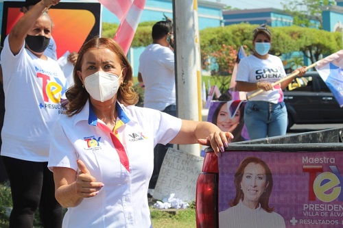 Villa de Álvarez, Col; a 16 de mayo de 2021.- Acompañado por cientos de simpatizantes que aprueban y respaldan su proyecto, esta tarde la Maestra Tey Gutiérrez Andrade, abanderada de la coalición Va por Colima en busca de la Presidencia municipal de Villa de Álvarez, realizó con éxito una mega brigada de impacto en el crucero de la avenida J. Merced Cabrera y Av. Benito Juárez en Villa de Álvarez centro.