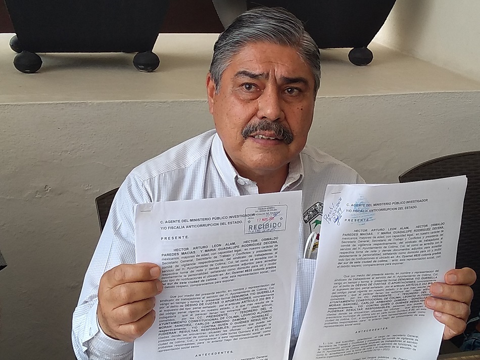 El Sindicato de Trabajadores al Servicio del Ayuntamiento de Colima presentó sendas denuncias penales en contra del presidente municipal con licencia, Leoncio Alfonso Morán Sánchez, al Ayuntamiento capitalino y al tesorero Armando Zamora González, por el desvío de 40 millones de pesos de aportaciones patronales y de los trabajadores para el Instituto de Pensiones (IPECOL).