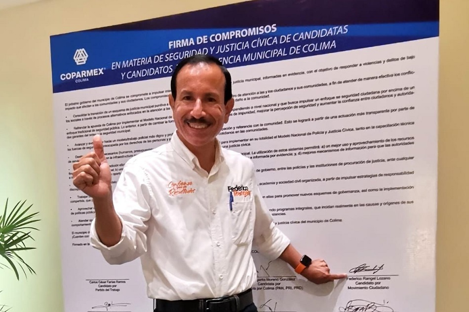 Federico Rangel Lozano, candidato a Presidente Municipal de Colima por Movimiento Ciudadano firmó los nueve “Compromisos en Materia de Seguridad y Justicia Cívica de Candidatos y Candidatas a la Presidencia Municipal de Colima” convocado por la Confederación Patronal de la República Mexicana (Coparmex) en Colima.
