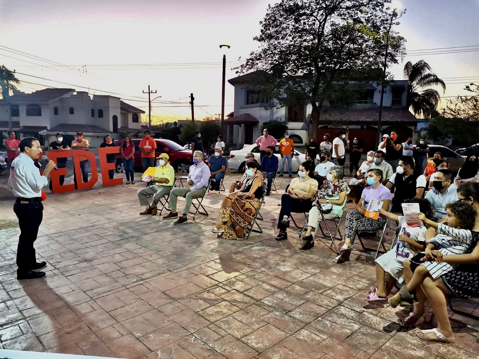 Acompañado de su esposa Leticia Contreras Cortés e integrantes de la planilla, Rangel Lozano se reunió con vecinas y vecinos de Jardines Vista Hermosa, con quienes dialogó y generó compromisos de mejorar el entorno de la colonia.