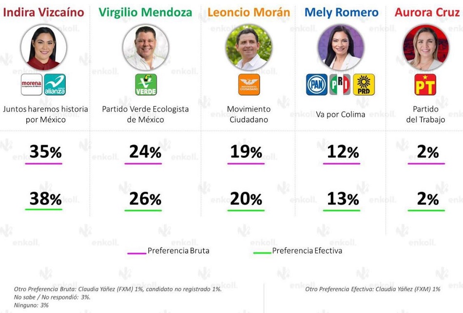 De acuerdo con este estudio demoscópico, Mendoza Amezcua obtuvo el 26% en la intención al voto, Leoncio Morán el 20%, Mely Romero del PRI, PAN y PRD el 13%