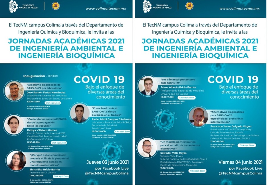 El Tecnológico Nacional de México campus Colima realizará este jueves 3 y viernes 4 de junio las Jornadas Académicas 2021: Covid-19 que serán en linea, cuyo objetivo es con un ciclo de conferencias brindar un panorama sobre algunos aspectos de la enfermedad que ha afectado a nivel mundial.