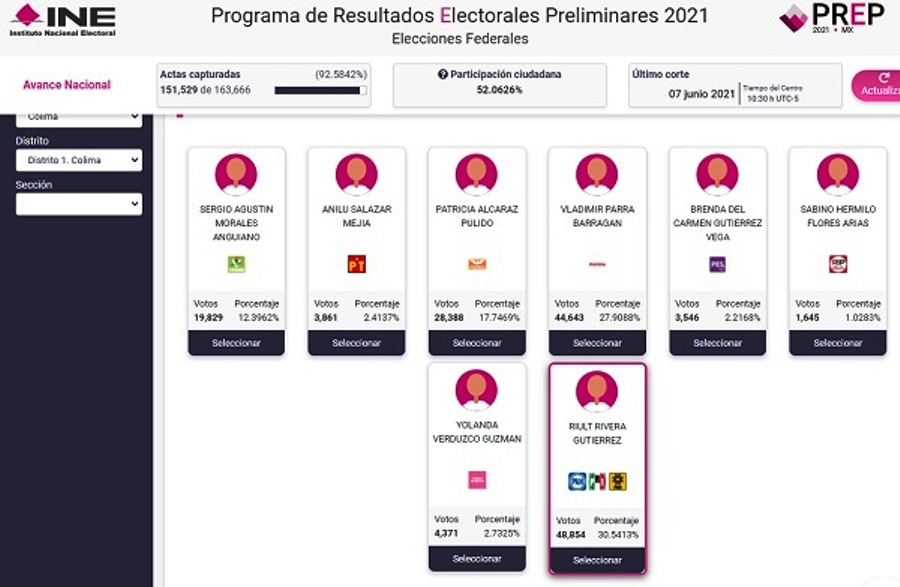 En el distrito 01, con circunscripción en Colima, Ruilt Rivera Gutiérrez, candidato de la Coalición “Va Por México”, obtendría el triunfo al contabilizar 48 mil 854 sufragios a su favor, lo que representa el 30.54 por ciento de la votación, contra 44 mil 643 votos de su más cercano competidor Vladimir Parra Barragán de Morena, habiendo una diferencia de 4 mil 211 sufragios.