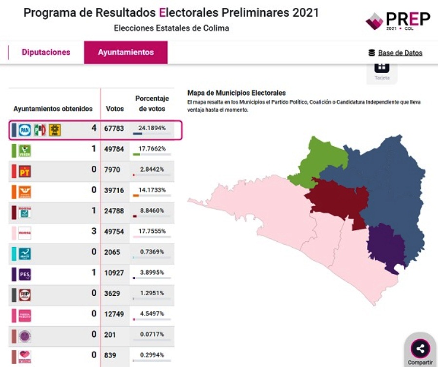 Luego de que concluyera el cómputo del Programa de Resultados Electorales Preliminares (PREP) de acuerdo a los resultados, cuatro ayuntamientos estarán gobernados por Morena, cuatro la coalición “Va Por Colima” (PRI-PAN-PRD), uno el Partido Encuentro Solidario (PES) y otro el Partido Verde Ecologista de México.
