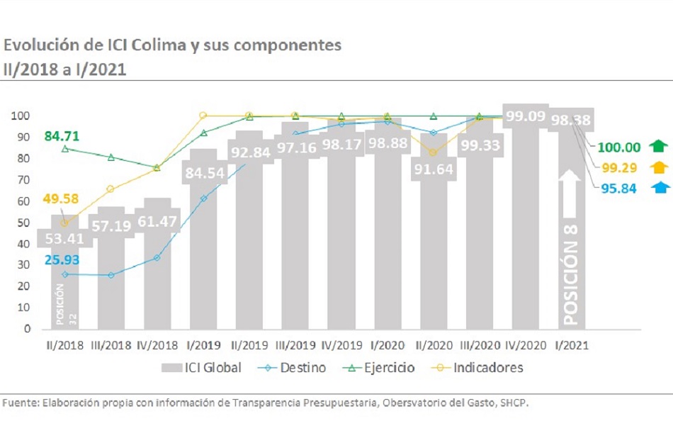 “Al primer trimestre de 2021, Colima se colocó en la posición 8 del Índice de Calidad de la Información (ICI) con una calificación de 98.38 puntos. Este puntaje refleja los resultados alcanzados en cada uno de los componentes del ICI; en el componente de Gestión de Proyectos (C1) alcanzó la posición 7; en Consistencia en recursos transferidos (C2) el primer escaño; mientras que en Indicadores (C3) obtuvo el lugar 8” sentenció.