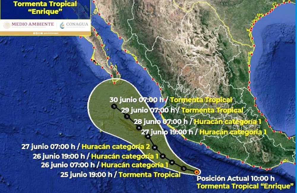 De acuerdo al Servicio Meteorológico Nacional (SMN) la circulación de la tormenta tropical "Enrique" originará lluvias muy fuertes a puntuales intensas sobre las costas del Pacífico Central Mexicano, occidente y sur del país, además de generar chubascos y lluvias fuertes con descargas eléctricas en el centro del territorio nacional, incluido el Valle de México.