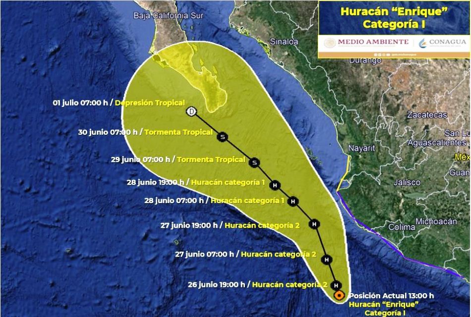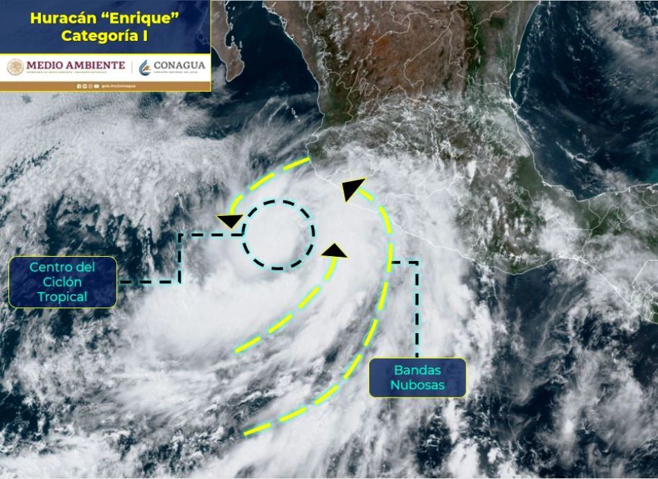 El Huracán "Enrique" se mantiene como categoría I en la escala de Saffir-Simpson, su centro se localiza al suroeste de las costas de Michoacán, el sistema continúa intensificándose. Las bandas nubosas de este sistema producen lluvias intensas a torrenciales sobre el occidente y sur del territorio nacional.