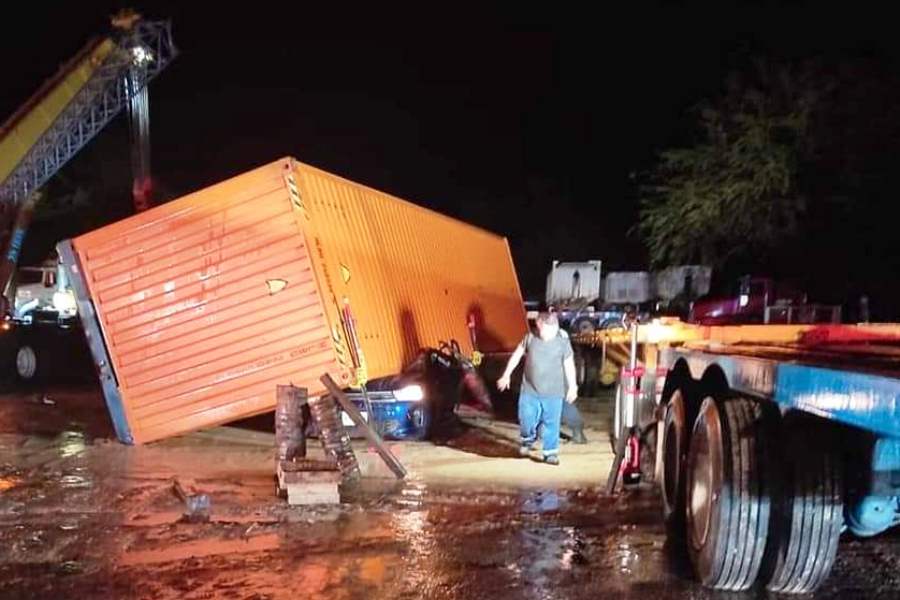 De acuerdo al reporte, el contenedor cayó encima de un vehículo particular en donde transitaban dos personas, las cuales quedaron prensadas entre el contenedor y los fierros retorcidos del automotor.
