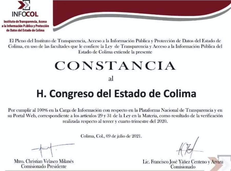 Los comisionados del Instituto de Transparencia, Acceso a la Información Pública y Protección de Datos del Estado de Colima (INFOCOL), Christian Velasco Milanés y Francisco Yáñez Centeno entregaron la Constancia a la LIX Legislatura donde se acredita el cumplimiento del 100% de las obligaciones en materia de transparencia.