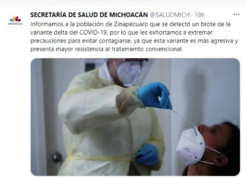 Además, la Secretaría de Salud en sus redes sociales también informó que se detectó un brote de la variante delta del COVID-19 en el municipio de Zinapécuaro, por lo que exhortó a extremar precauciones para evitar contagiarse, ya que esta variante es más agresiva y presenta mayor resistencia al tratamiento convencional.