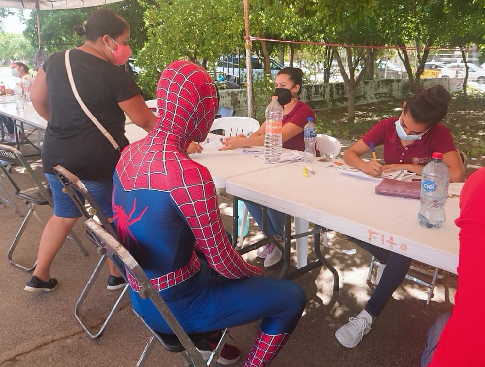 Manzanillo, Col. El Hombre Araña, acudió este día lunes a vacunarse contra Covid-19, durante la campaña realizada en el Casino de la Feria de Manzanillo.
