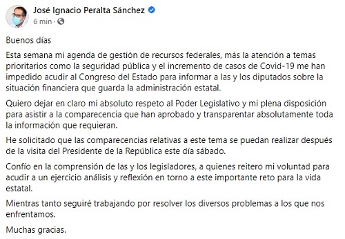 A través de sus redes sociales el gobernador del estado de Colima, José Ignacio Peralta Sánchez, anunció que ante las gestiones que realiza con instancias federales para resolver la problemática de la falta de liquidez financiera de su administración, no podrá acudir a comparecer ante los legisladores, tal y como fue convocado para este día viernes a partir de las 4 de la tarde.
