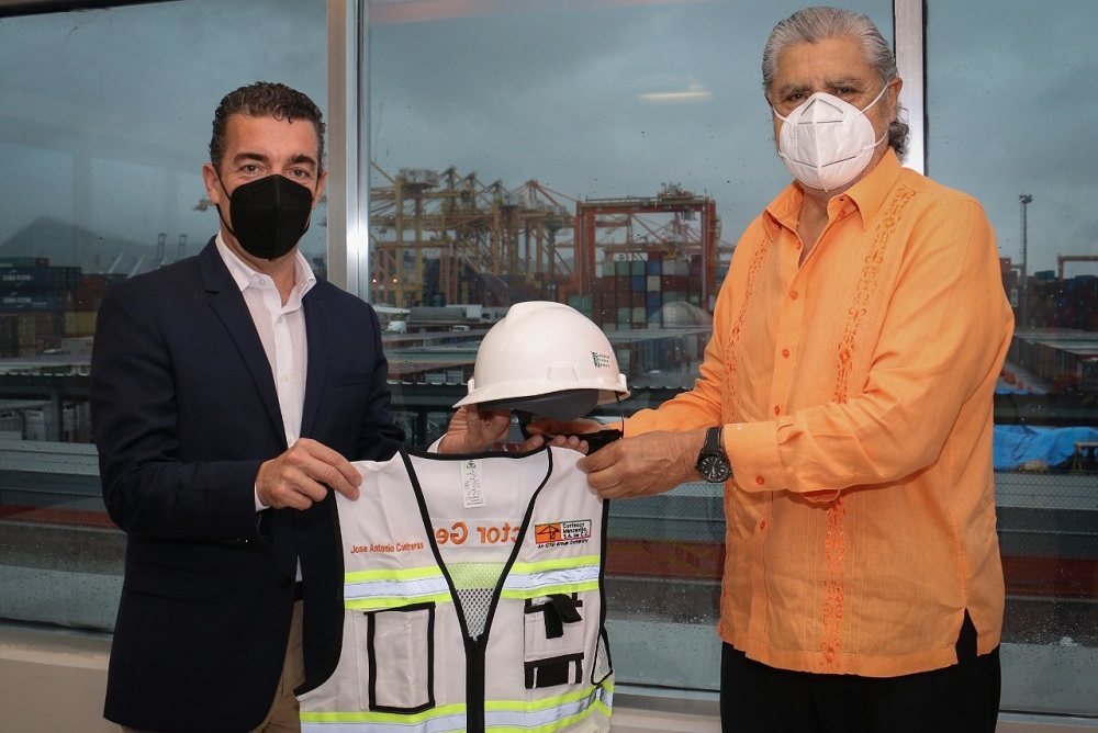 Manzanillo, Col. En el marco del 8vo. aniversario de Contecon y al cumplir con la meta de los 6 millones de Teu´s, Fortino Landeros Ruiz hizo entrega del casco y chaleco a José Antonio Contreras, quien asume a partir del día de hoy la Dirección General de la Terminal Especializada de Contenedores II.