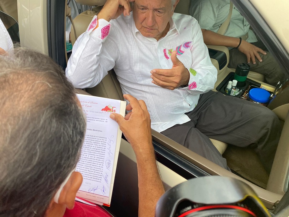 El secretario general del Sindicato de Trabajadores al Servicio del Gobierno del Estado (STSGE), Martí Flores Castañeda, entregó al Presidente de México un documento en donde le pide su apoyo para que pago de las quincenas de los burócratas estatales y solicita que intervenga para que pueda haber orden financiero en la entidad.