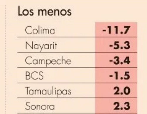 En Colima la caída del gasto federalizado fue de 11.7%, seguido de Nayarit con 5.3% menos, Campeche con 3.4% a la baja y Baja California Sur con 1.5% también hacia abajo.