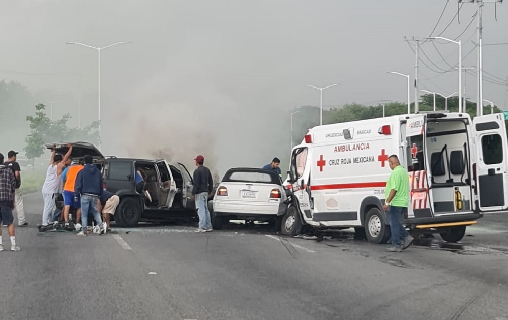 Villa de Álvarez, Col. Esta tarde se suscitó un fuerte choque en el Libramiento Gobernadora Griselda Álvarez, en donde se vieron involucrados tres vehículos, uno de ellos una ambulancia de la Cruz Roja Mexicana, reportándose daños materiales y varios lesionados, pero todos ellos en estado no grave.