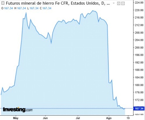 Con datos de la empresa Investing.com, se dio a conocer que en el presente año el mineral de hierro alcanzó su pico máximo de costo el 16 de julio cuando la tonelada se pagó a 219.60 dólares, pero que a partir del 30 del mismo mes en que se pagaba a 212.01 dólares la tonelada, por diversos motivos el precio se desplomó en una sola jornada hasta los 181.13 dólares, indicándose que durante todo el mes de agosto el precio ha ido a la baja hasta que este día 17 llegó a los 167.34 dólares la tonelada.