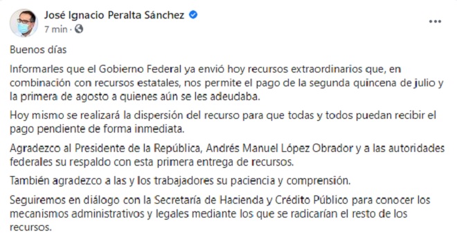 El gobernador del estado de Colima, dio a conocer que el gobierno federal ya envió hoy recursos extraordinarios que, en combinación con recursos estatales, les permite el pago de la segunda quincena de julio y la primera de agosto a quienes aún se les adeudaba.