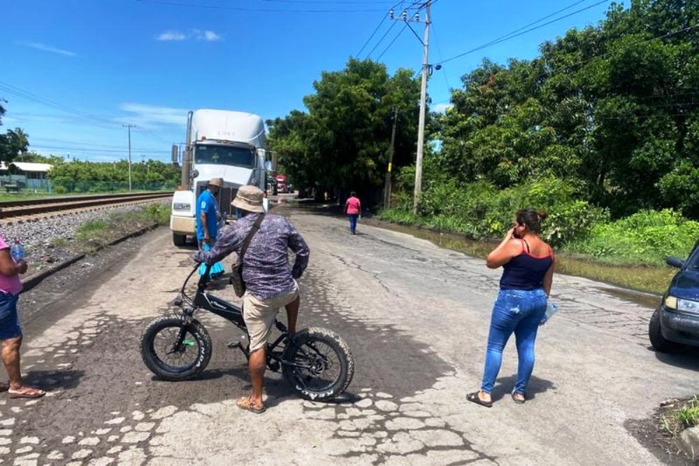 Desde las diez de la mañana de este lunes, alrededor de 20 vecinos a la colonia “La Estación” mantiene bloqueado el paso de transporte pesado que llega a las empresas USG y Termiun (almacén), ubicadas en la zona aledaña a la vía y a las casas.