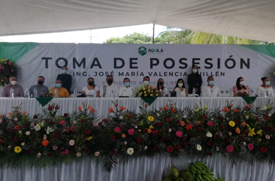 Así las cosas, con éxito, con más de 500 asistentes que fueron ubicados en la explanada municipal respetando las medidas para no contagiarse de Covid 19, se celebró la sesión solemne de cabildo en la que tomó posesión como nuevo Presidente Municipal de Aquila, José María Valencia Guillen, Chema Valencia, quien tras rendir la protesta de rigor, en su mensaje dijo que no les va a fallar a los aquilenses y se comprometió a trabajar con un gobierno abierto, que escuche y reciba a todo aquel que quiera platicar con el alcalde.