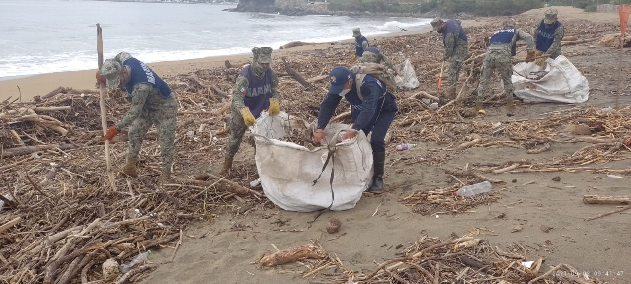 En coordinación con personal del Ayuntamiento de Manzanillo, elementos de la Secretaría de Marina-Armada de México, adscritos a la Sexta Región Naval, llevaron a cabo este 1 y 2 de septiembre una jornada de limpieza de playas que son punto de arribo y desove de tortugas, en virtud de que se vieron afectados por el paso del Huracán “Nora”.