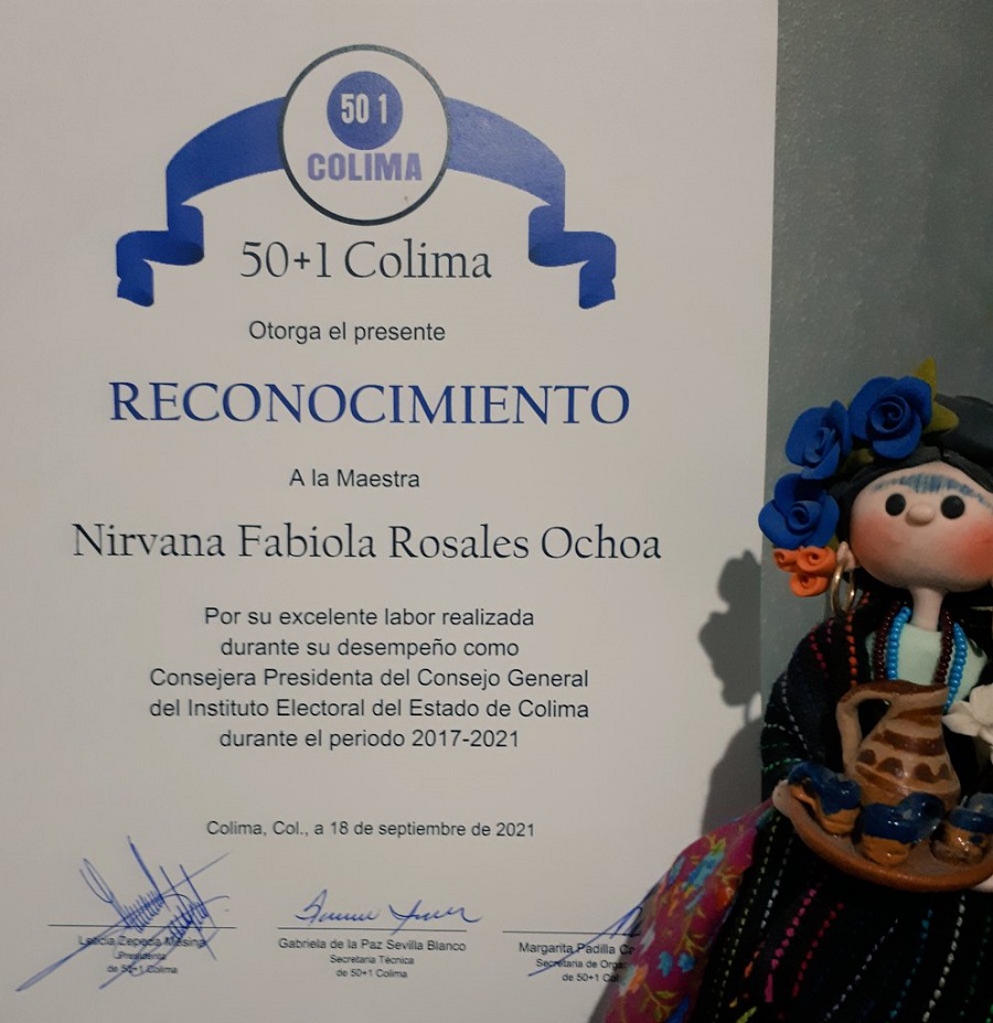 Este sábado, integrantes del Colectivo de Mujeres 50+1 entregaron un reconocimiento a la Consejera Presidenta del Instituto Electoral del Estado (IEE), Nirvana Fabiola Rosales Ochoa, por su trayectoria y trabajo a favor de la paridad.