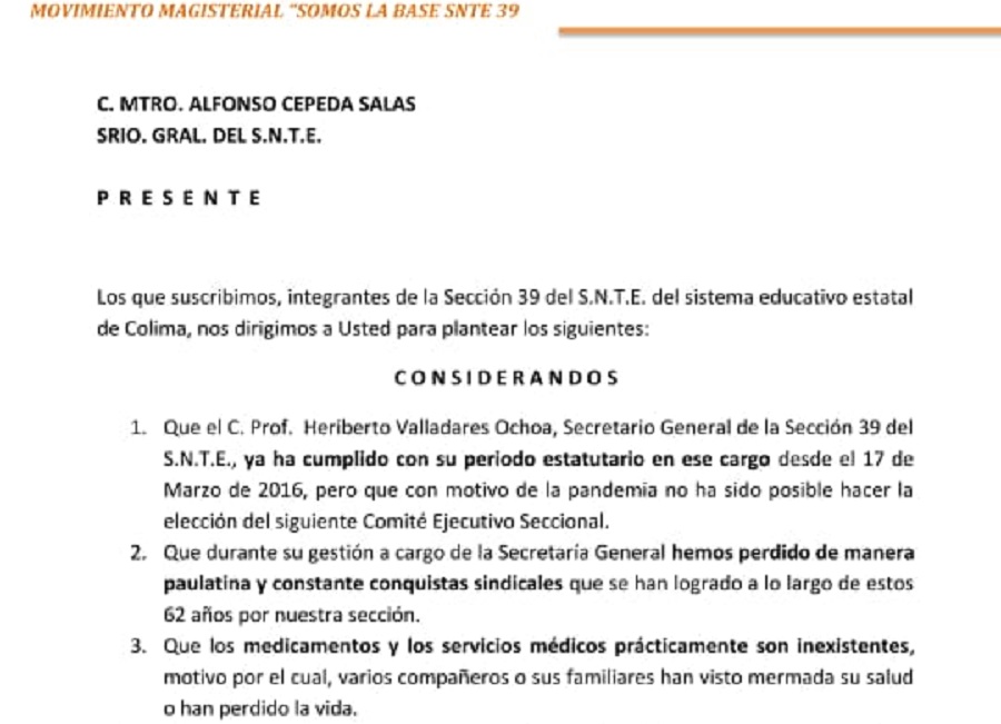 En un oficio dirigido a Alfonso Zepeda Salas, secretario general del CEN del SNTE, los integrantes de este movimiento magisterial exponen que Heriberto Valladares ya ha cumplido con su periodo estatutario desde el pasado 17 de marzo de 2016, pero que con motivo de la pandemia no ha sido posible hacer la elección del siguiente Comité Ejecutivo Seccional.