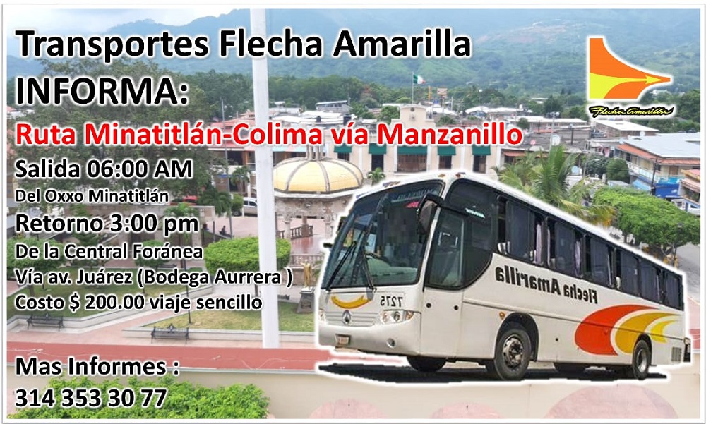 Minatitlán, Col. En información proporcionada a este medio de comunicación, debido a los derrumbes registrados en el kilómetro 34 de la carretera Minatitlán-Villa de Álvarez y en virtud de que aún continúan realizando los trabajos de restauración, Flecha Amarilla dio a conocer que, estará ofreciendo viajes de Minatitlán a Colima vía Manzanillo todos los días, la salida será a las seis de la mañana del Oxxo que está ubicado en la cabecera municipal hasta llegar a la Central Foránea de la Ciudad de Colima, el retorno será a las tres de la tarde, el costo será de 200 pesos viaje sencillo.