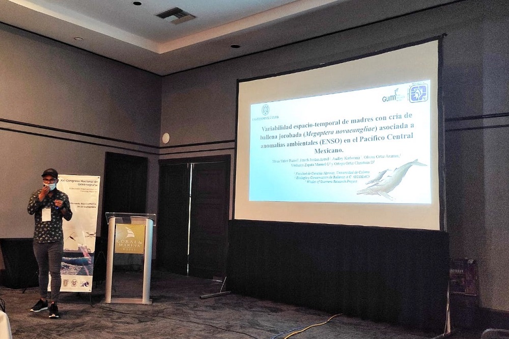 El joven universitario dictó la conferencia “Variabilidad espacio-temporal de madres con cría de ballena jorobada (Megaptera novaeangliae) asociada a anomalías ambientales (ENSO) en el Pacífico Central Mexicano”, en la que habló de una investigación realizada en coautoría con Astrid Frisch Jordan, Katherina Audley, Aramis Olivos Ortiz, Gerardo Verduzco Zapata y Christian Ortega Ortiz.