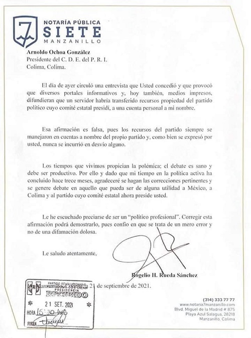 Mediante un documento dirigido al presidente estatal del Partido Revolucionario Institucional (PRI) en Colima, Arnoldo Ochoa González, el notario público y exdirigente del tricolor en el estado, dice que no es verdad que transfirió recursos del partido a su cuenta personal.