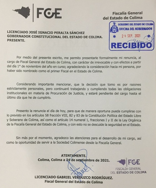 El pasado viernes 24 de septiembre, el Fiscal General Gabriel Verduzco Rodríguez, presentó mediante oficio dirigido al gobernador del estado, José Ignacio Peralta Sánchez su renuncia, con carácter irrevocable, a partir del 1º de noviembre de 2021.