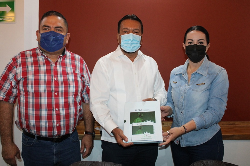 La presidenta de la Comisión Permanente la diputada Claudia Aguirre Luna, junto con el diputado Guillermo Toscano Reyes recibieron, del Fiscal General del Estado Gabriel Verduzco Rodríguez, el Tercer Informe de Actividades de ese organismo.