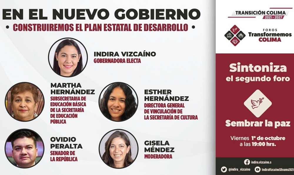 Con el objetivo de continuar con la dinámica virtual de los Foros Transformemos Colima, Martha Velda Hernández Moreno, Subsecretaria de Educación Básica del Gobierno de México; Esther Hernández Torres, Directora General de Vinculación de la Secretaría de Cultura del Gobierno de México y el Senador de la República Ovidio Salvador Peralta Suárez participarán en la segunda edición del foro “Sembrar la paz”, a transmitirse este viernes 01 de octubre, a través de las plataformas oficiales de la gobernadora electa de Colima, Indira Vizcaíno Silva, en punto de las 19:00 horas.
