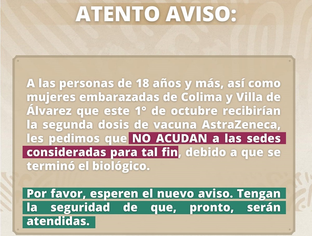 La Secretaría de Salud informa que la aplicación de la segunda dosis de vacuna anticovid para personas de 18 años y más, programada para este viernes 1 de octubre en Colima y Villa de Álvarez, se pospone hasta nuevo aviso.