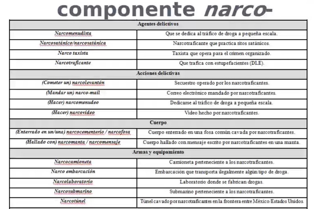 Si bien explicó que parte de esta terminología no es nueva, pues mucha de ella proviene de palabras comunes en la sociedad mexicana, sí se observan cómo los neologismos, anglicismos, creaciones metonímicas y metafóricas, el uso de nombres de animales, insectos, y el componente de la palabra narco, “se han modificado para designar una nueva realidad casi permanente, en especial cuando se trata de denominar a los agentes delictivos y sus métodos criminales”.