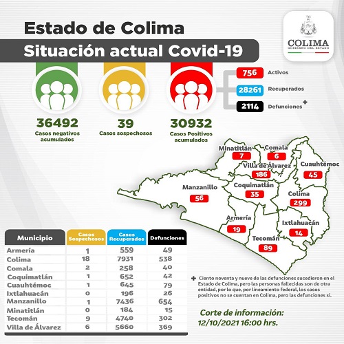La Secretaría de Salud informa que las 7 defunciones ocurrieron en 6 hombres (uno de ellos foráneo) y 1 mujer, entre los 50 y más de 65 años de edad, que estaban hospitalizados graves. 3 eran originarios de Colima, 2 de Tecomán, 1 de Villa de Álvarez y la persona foránea que era atendida en Colima.